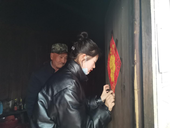 图为自动化1901班郑阳同学给彭爷爷贴“福”字