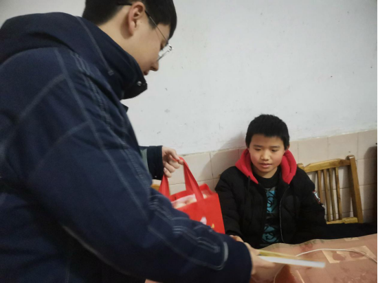 图为电气1905班陈思宇同学为留守儿童送来书籍