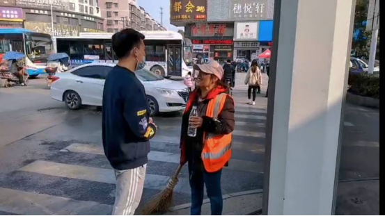图为新能源1901班严子杰同学慰问商场保洁阿姨