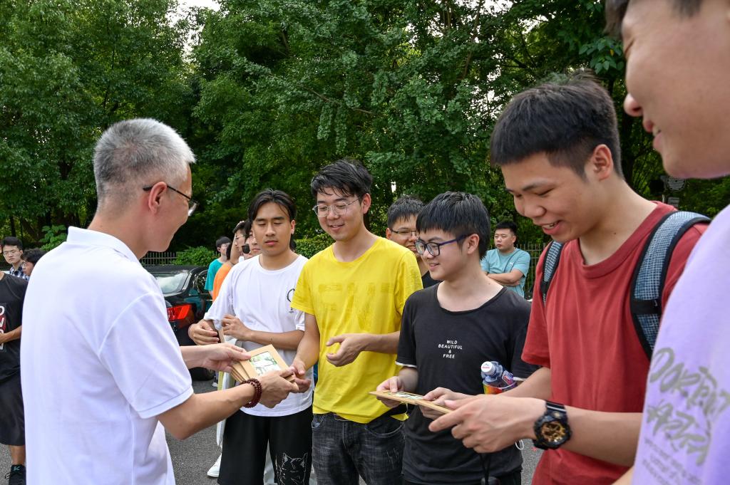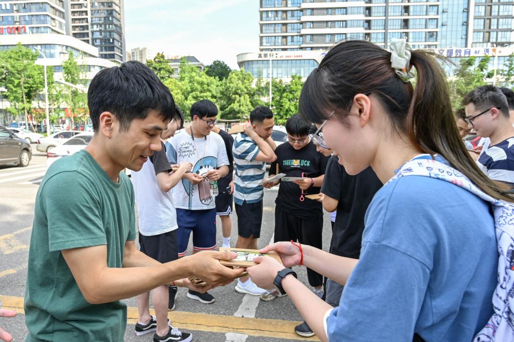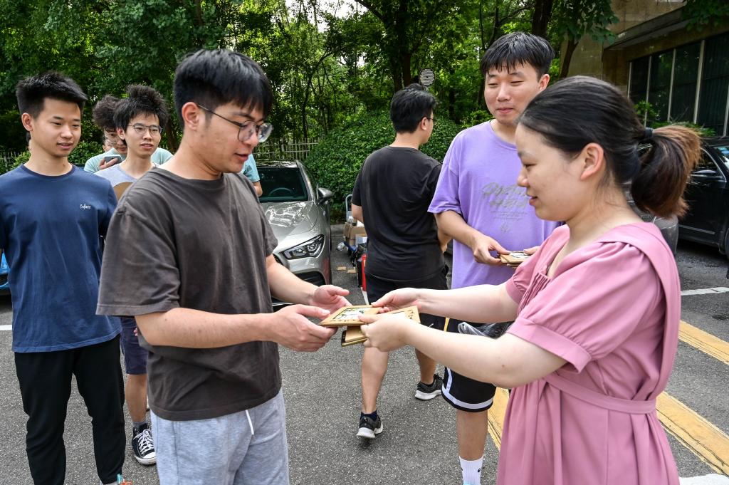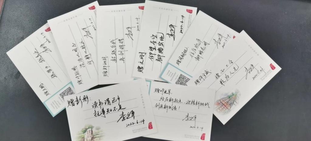 “记得来校报到那天,我和父母一起在校训石前合影。”“这些卡片满载大学四年的记忆,我一定会永远珍藏。”“现在就要说再见,感谢四年帮助过我的老师、同学们。”“即将远行,拿到学院的贺卡,将带着这些祝福启程。”毕业生纷纷表示。有的同学拿起手机扫描贺卡背面的二维码,《栀子花开》的声音传来,同学们也不自觉的跟着哼唱起来“光阴好像流水飞快,日日夜夜将我们的青春灌溉……”唱出了对美好青春的回忆。