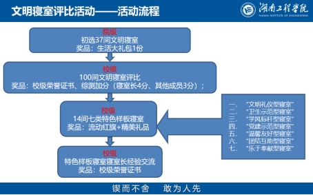 通过广泛宣传和动员,学院有100余间寝室主动报名参加院级文明寝室评选。10月13~25日,学院结合寝室内务现场打分及本学期日常工作四项检查结果进行评定,按总分从高到低评选出36间院级文明寝室参加校级文明寝室的评选活动。