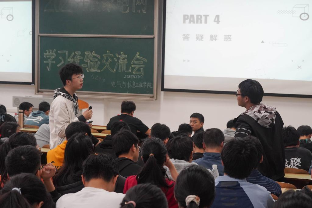 杨强同学在备考经验分享中建议学弟学妹:“可以通过看网课先形成大概的知识体系,再去背诵知识点会更加轻松;在对讲义内容较为熟悉时再回归课本,会取得事半功倍的效果。”徐羽柔同学详细的介绍了自己复习备考的时间规划,并激励大家“如果下定了决心,就要全身心投入、全力以赴,不给自己留下遗憾”。其它主讲人则从备考国网所需准备的各个科目出发,向同学们列举了每门科目的学习方法及参考教材,并鼓励同学们明确目标、坚定信心。在最后的现场答疑环节,正在复习备考的低年级同学踊跃发言,纷纷就自身关注的问题进行提问。