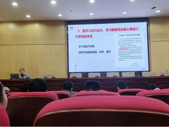 在本次活动中,大学生心理健康教育中心的陈竹老师讲解了大学生心理危机干预的主题内容,文梦雪老师介绍了心理委员的工作职能,包卫老师讲解了大学生常见心理问题与调试方面的知识。