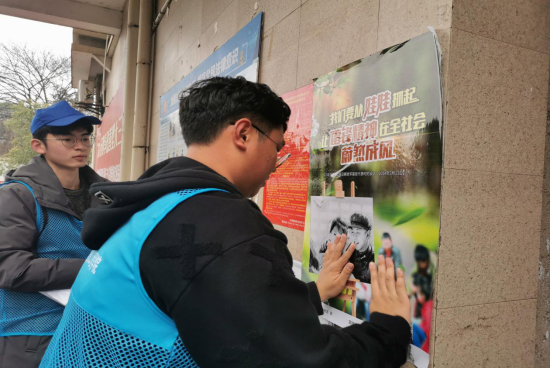 第三支队伍的志愿者协助社区工作人员张贴“学雷锋”海报。同时,志愿者们对社区主干道和卫生死角进行清扫,帮助孤寡老人打扫卫生、整理家务。志愿者们还给居民宣传防疫知识,提醒群众做好卫生清洁的同时保持对疫情的防控。