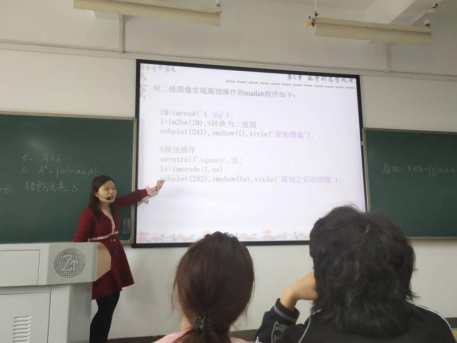 11月2日下午,李婷老师为我们带来了《数字图像处理》的公开课。李婷老师以两幅图片导入,引导学生进入课堂主题——数学形态学;接着,她条理清晰地讲解本节课的概念,并利用编程工具让学生看到理论的实际效果;最后,设计班级比赛的互动环节,考核学生对本节课理论知识的理解程度,课堂气氛非常活跃,达到了寓教于乐的目的。