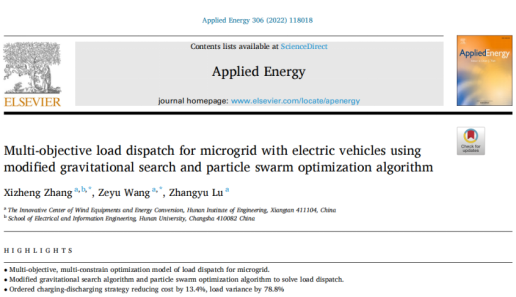 在湖南工程学院70周年华诞之际,我校2019级硕士研究生王泽宇(Zeyu Wang)以论文成果形式献上对母校最真切的祝福,感谢母校的培养。文章“Multi-objective load dispatch for microgrid with electric vehicles using modified gravitational search and particle swarm optimization algorithm”发表于中科院一区TOP期刊《Applied Energy》,影响因子9.746。上述研究得到了国家自然科学基金的支持和研究生指导老师张细政教授的指导。