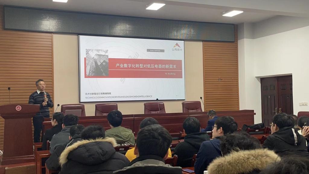 首先,由叶秀峰董事长介绍了山秀阳光有限公司的企业概述、企业文化和企业资质等情况,并从就业形势、专业就业前景等角度,为同学们阐释了作为一名电气人应有的就业观。随后,优秀校友田新疆对产业数字化转型的三大原动力与具体内容、当前对低压电器的新需求做了详细的介绍,还结合亲身经历向同学们分享了许多宝贵的工作技巧和经验,并着重指出目标定位对未来择业的重要意义,强调找到心仪的工作最重要、最基本的要求是具有良好的专业素养,他希望同学们在大学四年中能够认真学习,为将来就业打好基础。