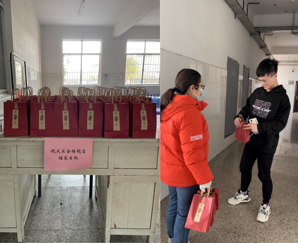 “加油!你一定可以!” “祝你成功上岸!”学院辅导员老师亲切慰问考研学子,为他们送上了诚挚的祝福和心意满满的“加油包”。“加油包”中有老师们精心准备的明信片、橙子和牛奶,橙子寓意各位考生心想事“橙”,明信片上写满了鼓励的话语,“愿你熬得过万丈孤独,藏得下星辰大海”“岁月不负少年意,旗开得胜终有时”……学院领导、教研室老师认真写下饱含深情的赠言,寄托了老师对同学们们满满的期待与祝福。