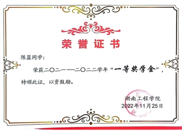 2021年8月  被湖南省教育厅、共青团湖南省委、湖南省科学技术协会、湖南省社会科学院、湖南省学生联合会评为第十四届“挑战杯”湖南省大学生课外学术科技作品大赛三等奖