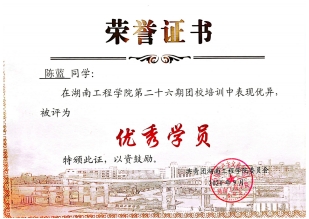 2020年9月   被共青团湖南工程学院委员会评为第二十六期团校培训“优秀学员”,并在第二十七期团校培训上作为优秀学员代表发言