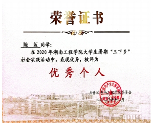 2020年12月  被共青团湖南工程学院委员会评为暑期三下乡社会实践“优秀个人”