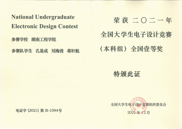 本科期间被选拔进入大学生创新基地,积极组织和参加学科竞赛,获得全国大学生电子设计大赛全国一等奖,湖南省大学生电子设计大赛省级一等奖;“挑战杯”湖南省大学生创业计划竞赛省级三等奖等多个奖项;还获得“矿检机器人”专利一项,“智能手环”专利一项。